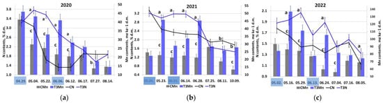 Seasonal changes in foliar N (lines, left scale) under the influence of manganese treatments (bars: foliar Mn, right scale) in the seasons of (a) 2020, (b) 2021, and (c) 2022. The dates of spraying are highlighted in blue (see also Figures S1–S3 and Tables S1–S15). d.m.—dry matter. The letters a and b—significant differences between lines, and the letter c—significant differences between bars.