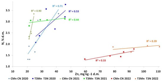 There was a strong correlation between foliar N and Mn contents in certain treatments (Figure 3). Interestingly, in the control, these relationships were even stronger than in the experimental treatments. The peak values of N and Mn departed from the common trend of the corresponding treatment, likely due to the lag between the peaks of Mn after the spraying and the following increase in foliar N. The strongest foliar Mn vs. foliar N correlation was observed in May–June. This indicates that the most pronounced effect of foliar fertilization can be expected in the periods of the highest micronutrient demand by the plant.