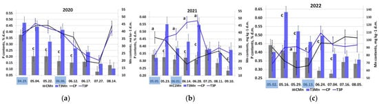 Seasonal changes in foliar P (lines, left scale) under the influence of manganese treatments (bars: foliar Mn, right scale) in the seasons (a) 2020, (b) 2021, and (c) 2022. The dates of spraying are highlighted in blue (see also Figures S4–S6 and Tables S1–S15). d.m.—dry matter. The letter a—significant differences between lines, and the letter c—significant differences between bars.