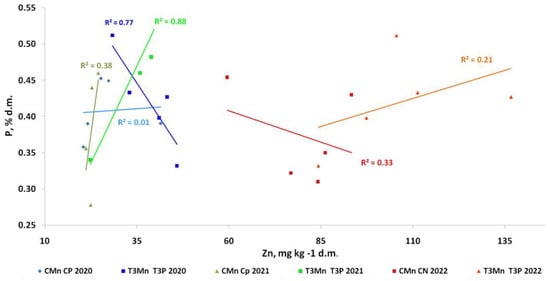 The foliar P contents had a strong upward trend, while the foliar Mn increased in the control (R2CMnCP2022 = 0.38) but especially after Mn treatments (R2T3MnT3P2021 = 0.88) in 2021 (Figure 5). The correlation was not so strong in 2022. In this year, the increase in leaf phosphorus contents was recorded only after Mn spraying. (R2T3MnT3P2022 = 0.21).