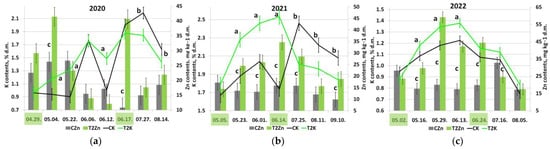 Seasonal changes in leaf potassium (lines, left scale) under the influence of manganese treatments (bars: foliar Zn, right scale) in the seasons (a) 2020, (b) 2021, and (c) 2022. The dates of spraying are highlighted in green (see also Figures S7–S9 and Tables S1–S15). d.m.—dry matter. The letters a and b—significant differences between lines and the letter c—significant differences between bars.