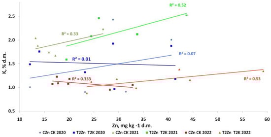 The information about the influence of microelements on foliar K is scarce; its studies are complicated by the different mobility of mineral nutrients in plants. The most spectacular results in our study were obtained for Zn spraying. Though in 2020 we did not see a relationship between Zn treatments and foliar K, this relationship was evident in 2021 and 2022 (Figure 7). In 2021 and 2022, the foliar Zn spraying boosted the foliar K; this relationship was not observed in the control treatment in all seasons of the study.