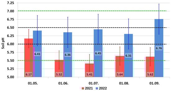 Soil acidity increased (the soil pH declined) on 1 May 2021 as compared to 14 August 2020. Later in 2021, soil acidity increased until 1 July 2021, when the lowest pH value was recorded. The pH values declined slightly until 1 August 2021 and remained at this level until 1 September 2021. The soil was mildly acidic, so the pH was favorable for the uptake of macronutrients in 2022. Attention must be paid to further increases in pHKCl, which took place by the end of the season. The pHKCl variation after chemical fertilization was relatively high (pH 5.53–7.10), impacting the significance of the difference in the values documented in 2022.