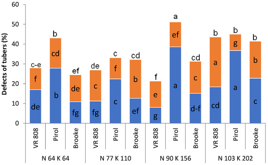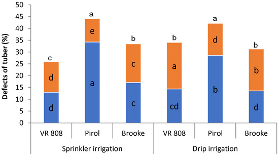 | Irrigation | Cultivar | Green Patches | Late Blight | Deformations | Secondary Growth | Bruises | Dry Rot |