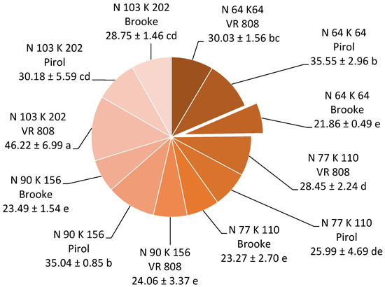 | N64K64 | VR-808 | 3.21 ± 0.75 ab | 0.74 ± 0.47 c | 14.66 ± 1.59 c | 14.41 ± 1.36 de | 155.93 ± 0.25 a–c |