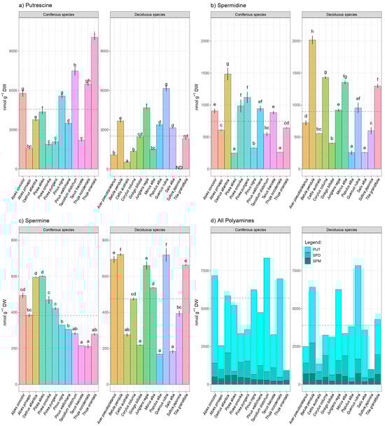 Species-specific level variation in major PAs: (a) putrescine (PUT), (b) spermidine (SPD), (c) spermine (SPM), as well as (d) total PAs within 24 coniferous and deciduous tree species collected in urban area. Different small letters indicate significant differences among different species; Tukey’s honestly significant difference (HSD) post hoc test (p ≤ 0.05). Data represent the mean ± standard deviation (SD).