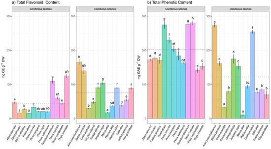 Species-specific level variation in (a) total flavonoids and (b) total phenolics contents within coniferous and deciduous tree species collected in urban areas. Different small letters indicate significant differences among different species; Tukey’s honestly significant difference (HSD) post hoc test (p ≤ 0.05). Data represent the mean ± standard deviation (SD).