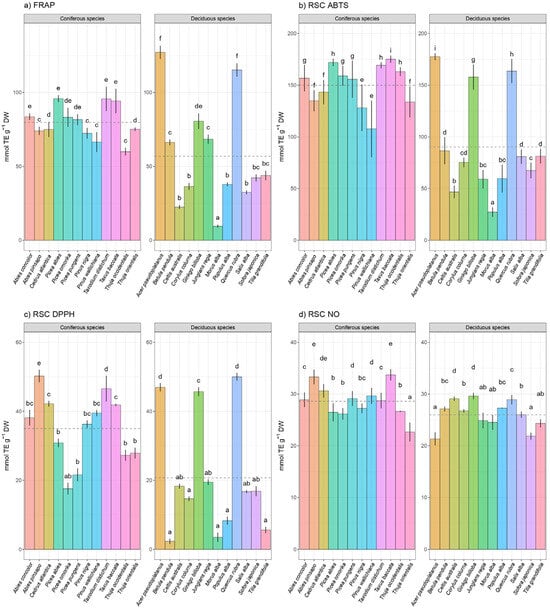 Total antioxidant capacity (mmol TEAC g−1 DW) measured by (a) FRAP, (b) ABTS, (c) DPPH assay and radical scavenger capacity against NO radical, and (d) RSC NO in leaves of 24 coniferous and deciduous tree species collected in urban area. Different small letters indicate significant differences among different species; Tukey’s honestly significant difference (HSD) post hoc test (p ≤ 0.05). Data represent the mean ± standard deviation (SD).