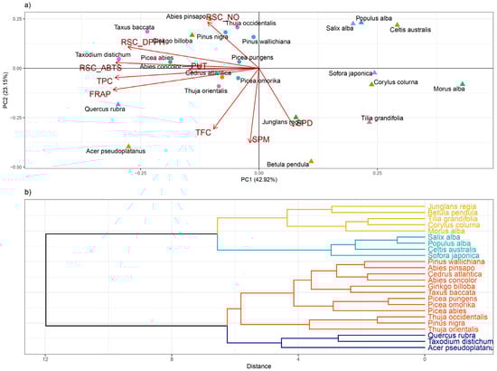 PCA analysis of all examined parameters in coniferous and deciduous tree species collected in urban areas (a) and hierarchical clustering of 24 analyzed tree species (b). The following abbreviations examined parameters: TPC: total phenolic content; TFC-total flavonoid content FRAP: ferric reducing antioxidant power; SPD: spermidine; SPM: spermine; PUT: putrescine; RSC DPPH: radical scavenger capacity against 2,2-Diphenyl-1-picrylhydrazyl radical, RSC NO: radical scavenger capacity against NO radical, RSC ABTS: radical scavenger capacity against 2,2′-azinobis(3-ethylbenzothiozoline)-6-sulfonic acid, ABTS•+.