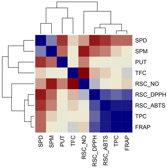 Pearson’s coefficient of the correlation matrix of the examined parameters in 24 examined coniferous and deciduous tree species collected in urban areas. Blue squares represent a highly significant correlation of inspected parameters, while red squares present low interaction assessed according to the corresponding Pearson’s coefficient. The following abbreviations examined parameters: TPC: total phenolic content; TFC: total flavonoid content FRAP: ferric reducing antioxidant power; SPD: spermidine; SPM: spermine; PUT: putrescine; RSC DPPH: radical scavenger capacity against 2,2-Diphenyl-1-picrylhydrazyl radical, RSC NO: radical scavenger capacity against NO radical, RSC ABTS: radical scavenger capacity against 2,2′-azinobis(3-ethylbenzothiozoline)-6-sulfonic acid, ABTS•+.