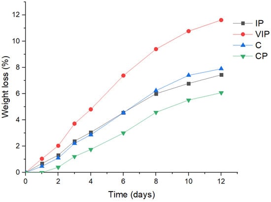 - Coating process (CP): This methodology was based on Muley and Singhal (2020) [17]. Firstly, the whey protein (WPC) was hydrated: 30 g of protein in 188.31 mL of distilled water. Then, the pH was adjusted to 7 by adding NaOH, and the solution was heated (55 °C, 10 min) with constant stirring. After, 1.59 g of sodium carbonate was added while maintaining the agitation and temperature, and 30 g of glycerol was also added. After cooling, the solution was stored under refrigeration (5 ± 1 °C) until its application. The fruit was submerged twice for 1 min, and then the samples were drained and placed in an oven for 10 min at 30 °C to ensure the elimination of the surface liquid.