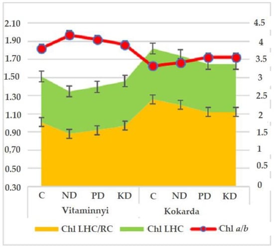 Elements of the photosynthetic apparatus of lettuce cvs. ‘Vitaminnyi’ and ‘Kokarda’ depending on the content of macronutrients in the nutrient solution. Control is the complete Knop’s nutrient solution with trace elements. ND, PD, and KD are the Knop’s nutrient solution with a reduced content of nitrogen, phosphorus, and potassium. Chl LHC/RC and Chl LHC are located on the main axis, Chl a/b on the auxiliary one. The standard errors of mean trait values (±SEM) are given.