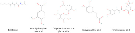 - Ji, R.; Quan, Q.; Guo, X.; Zhang, J.; Song, Y.; Zhu, M.; Tan, P.; Han, J.; Liu, Y. Simultaneous determination of five N-alkylamides in the root of Anacyclus pyrethrum by HPLC and profiling of components in its methanolic root extract by UPLC/Q-TOF-MS. Rev. Bras. Farmacogn. 2019, 29, 152–161. [Google Scholar] [CrossRef]