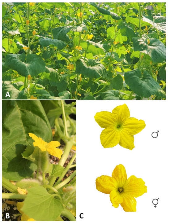 Plants of Scopatizzo with main stem vertically trained at full flowering stage (A). Side view of ermaphrodyte flower of Scopatizzo (B). Top view of male (top) and ermaphrodithe (bottom) flower of Scopatizzo (C).