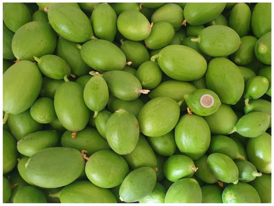 Scopatizzo is characterized by its relatively small-sized fruits, which have a light and sparse fuzziness. They are light green in color, have an elliptical shape and an oval-shaped longitudinal section (Figure 2) [10,11]. At the commercial harvest, the Scopatizzo fruits do not have well-formed seeds. In fact, in addition to the flesh (mesocarp), the central part (placenta) of the fruit can be eaten like other genotypes of Apulian unripe melons [9,10,11]. The leaves are of medium size and have a pentalobed shape with slight leaf margin serration. The flowers, typically yellow in color for the species, exhibit an andromonoecious-male expression, with a predominance of male flowers [10,11]. Each Scopatizzo plant can produce more than 10 fruits with an average yield of around 2600 g plant−1 [10].