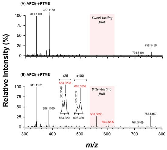 APCI(−)-FTMS spectra of the ethanolic extracts of sweet (A) and bitter-tasting (B) ‘Scopatizzo’ melons (see Section 2.3 and 2.4 for additional information on sample preparation). The red-shaded m/z interval refers to the spectral region containing MS signals that discriminate the two samples due to the presence of cucurbitacins in bitter fruits. Highlighted in red are the accurate m/z values used for the tentative identification of cucurbitacins (see Table 1).