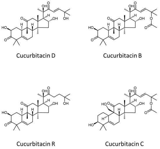 - Chen, J.C.; Chiu, M.H.; Nie, R.L.; Cordel, G.A.; Qiuz, S.X. Cucurbitacins and cucurbitane glycosides: Structures and biological activities. Nat. Prod. Rep. 2005, 22, 386–399. [Google Scholar] [CrossRef] [PubMed]