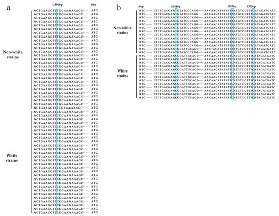 SNP variants in the genic and 2.5 kb promoter region of PcTYR. Panel (a) represents the one SNP at the promoter region (bp −1590, T to C), and panel (b) shows the three SNPs at an intron region (bp 1038, T to C; bp 1293, A to C; bp 1303, G to C) [10].