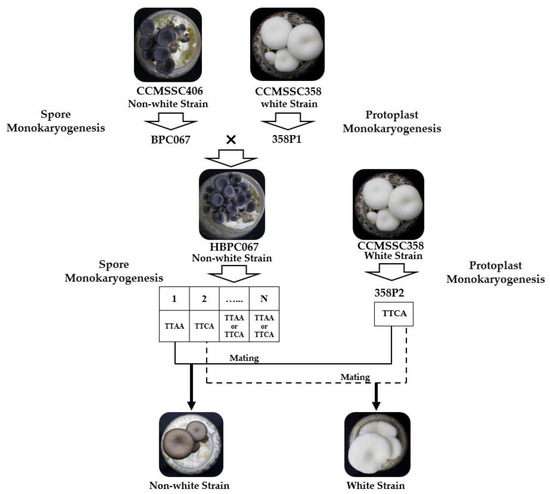The mushroom strains used in this experiment included P. cornucopiae strains CCMSSC00406, 406P1, CCMSSC00358, 358P1, and 358P2; the other oyster mushroom strains CCMSSC00328, CCMSSC00329, CCMSSC00363, CCMSSC00364, CCMSSC00499, CCMSSC00630, CCMSSC03989, CCMSSC04195, CCMSSC00387, CCMSSC00322, CCMSSC04976, CCMSSC04977; as well as the F2 segregating population previously developed [10]. The parental strains of the population were heterothallic strains 406 and 358, characterized by a black color (whiteness index [WI] = 26.23) and white color (WI = 59.67), respectively. The heterokaryotic strain HBPC067, with a black cap color (WI = 23.15), was obtained by crossing the monokaryotic spore isolate BPC067 from strain 406 with the homokaryotic strain 358P1 from the white parental strain 358. Through single-spore isolation, a segregating population of the heterokaryotic strain HBPC067 was obtained. This segregating population was then crossed with the homokaryotic strain (358P2) of the white strain 358 to produce the F2 heterokaryotic population [10] (Figure 2). All strains mentioned above were provided by the China Center for Mushroom Spawn Standards and Control (CCMSSC).