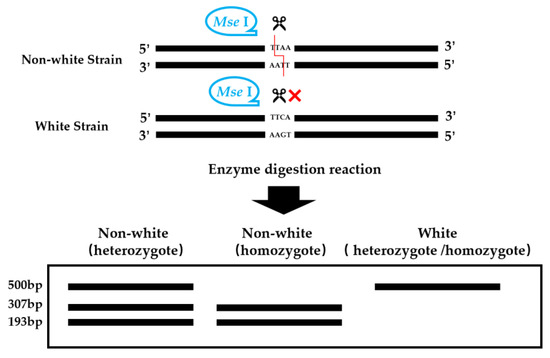 The dCAPS Finder 2.0 software was used for the selection of CAPS/dCAPS restriction enzymes. The main steps included: (1) selecting a 30 bp sequence on both sides of the SNP site and (2) inputting the original and mutated sequences of the SNP site into the dCAPS Finder 2.0 dialogue box to find restriction enzymes that could cut at the site. The corresponding markers were based on SNP-based CAPS/dCAPS markers [22]. Figure S1 shows four SNPs in white and non-white strains and the cleavage sites present at each SNP.