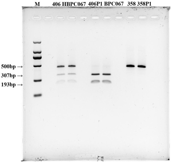 TYR-CAPS-3-2, on the other hand, displayed clear polymorphism between the parental strains after enzyme digestion. This marker is based on the variation in G/C alleles at the third SNP locus of the PcTYR gene, where strains with a G base have a black cap color, and strains with a C base have a white cap color. After digestion with the appropriate restriction enzyme, Mse I, TYR-CAPS-3-2 generated polymorphic bands (Figure 3). Dikaryotic black strains of 406 showed three distinct band patterns at 500 bp, 307 bp, and 193 bp, while the monokaryotic black strain 406-1 showed two band patterns at 307 bp and 193 bp. Both the dikaryotic white strain 358 and monokaryotic white strain 358-1 exhibited a single band due to the inability of the PCR product to be cleaved by the enzyme (Figure 4). TYR-CAPS-3-2 displayed good polymorphic effects after enzyme digestion and could clearly distinguish mushroom strains with black and white cap colors. The first (−1590 bp T>C), second (1038 bp T>C), and fourth (1303 bp G>C) SNP loci could not be successfully converted into stable and definitive CAPS markers capable of distinguishing dark and white strains of P. cornucopiae due to the lack of suitable restriction enzymes.