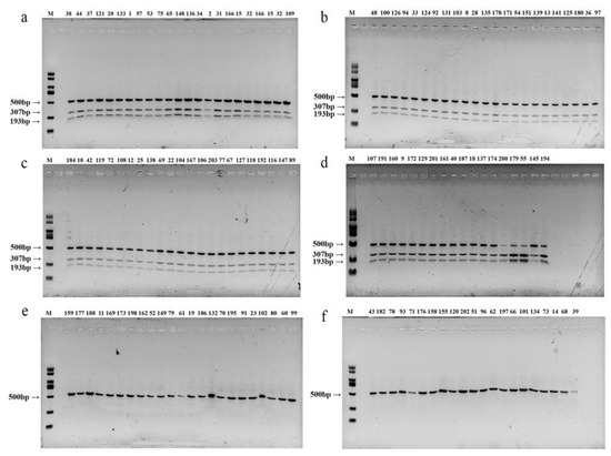 Polymorphic bands of restriction endonuclease Mse I of 131 individual strains (F2 population). M: 2000 bp DNA Marker; (a–d) is the enzyme cut band of non-white strains in the separated group; (e,f) is the enzyme cut band of the white strain in the separated group.