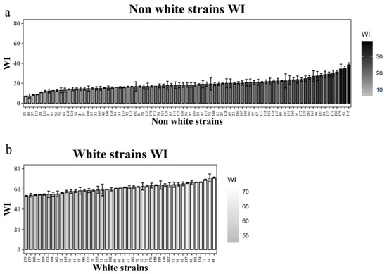 WI values of the caps for both non-white and white strains in the segregating population. The bar chart (a) represents the WI values of the non-white, while that of (b) depicts the WI values of the white strains. WI values greater than 40 indicated white strains, while values less than 40 indicated non-white strains.