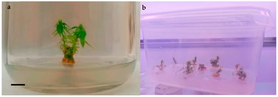To obtain uniform plant production, the micropropagation technique could be a useful tool. Indeed, in vitro propagation has great potential in rapidly producing many true to type clonal and high-quality plants using synthetic growth media in a controlled environment [12,13,14,15]. Micropropagation requires few selected mother plants as explant sources to initiate an in vitro culture [15]. Furthermore, the in vitro plants are grown in reduced spaces under sterile conditions to avoid the transmission of pests, diseases, and pathogens and the influence of weather or soil [16,17]. Due to all these advantages, in recent years, several researchers have developed different protocols to define the in vitro cultures of C. sativa subspecies sativa and indica derived from the leaves, axillary nodes, cotyledons, shoot tips, and epicotyls of explants with the aim to obtain a high multiplication rate, produce disease-free plants, select elite clones, and overcome the limits of heterozygosity from cross-pollination [15,18,19,20,21]. To the best of our knowledge, only two studies focused on the in vitro culture of the subspecies ruderalis. These studies underline the low branching tendency, strong apical dominance [22,23], and influence of the genotype on the explant’s behavior and multiplication rate. The difficulties of in vitro growth and the maintenance of a vegetative state may be due to auto-flowering varieties and photoperiod independence [11,24]. These factors could also be other limits for the micropropagation of this subspecies. Therefore, the main challenge in developing an effective micropropagation protocol is the specificity of species, varieties, and genotypes, resulting in different responses in vitro depending on the explant, nutrient media, and growth regulators, such as the culture conditions [21].