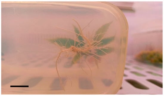 Rooted shoot of ‘Finola’ obtained under red/blue light, using IBA at the lower concentration (0.1 mg L−1), scale bar 1 cm.