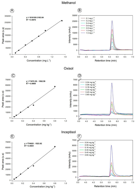 Linearity was assessed using seven concentrations of the diuron standard (98.0% purity, Sigma-Aldrich, Buchs, Switzerland) diluted in methanol (CH3OH) (0.1, 0.2, 0.4, 0.6, 0.8, 1, and 1.5 mg L−1) (Figure 1A,B). Another curve was prepared by fortifying the Oxisol and Inceptisol soils with concentrations of 0.04, 0.08, 0.16, 0.30, 0.40, and 0.80 mg kg−1 (Figure 1C,E). Each concentration was carried out in triplicate. The method showed good linearity, with a coefficient of determination (R2) of 0.9909 in Oxisol and 0.9951 in Inceptisol. The retention time (Rt) for diuron was 5.56 min (Figure 1B,D,F).
