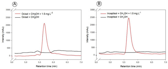 Selectivity was analyzed by comparing the overlapping chromatograms of the soil matrix in the absence and presence of the diuron standard following the methodology described by Queiroz et al. [31]. For the selectivity study, 5 g of Oxisol and Inceptisol were placed in 50 mL falcon tubes and fortified with 1 mL of solution containing the diuron standard diluted in methanol at a concentration of 1.5 mg L−1. Samples of Oxisol and Inceptisol without herbicide fortification were also prepared as a control. All the samples were taken in triplicate and left to stand in the dark for the methanol to evaporate. To extract the herbicide, 10 mL of methanol was added to each falcon tube. The tubes were shaken vertically at a temperature of 27 ± 2 °C for 3 h and centrifuged in a digital centrifuge (Kasvi, K14-0815P, Paraná, Brazil) at 4000 rpm for 7 min. The supernatant was removed using a volumetric pipette, filtered through a Milipore filter with a 0.45 µm PTFE membrane, and stored in vials with a capacity of 1.5 mL. The vials were analyzed using HPLC. Due to the absence of interferents in the Oxisol and Inceptisol matrix, the method was considered selective (Figure 2).