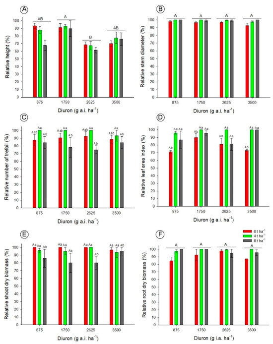 Plant height (A), stem diameter (B), number of trefoils (C), leaf area (D), aerial dry mass (E), root dry mass (F) of jack bean (Canavalia ensiformis) subjected to different doses of diuron (875; 1750; 2625; and 3500 g a.i. ha−1) and doses of rock powder (0, 4, and 8 t ha−1) in Inceptisol.