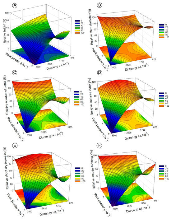 In Oxisol, no injury levels (IL) were observed in the phytoremediator C. ensiformis at 42 DAE. There was no interaction between the herbicide dosage and rock powder dosage for all the analyzed variables: plant height (HT) (F = 1.04, p = 0.41), aerial dry mass (AD) (F = 1.20, p = 0.32), number of trefoils (NT) (F = 0.50, p = 0.80), leaf area (LA) (F = 1.44, p = 0.22), stem diameter (SD) (F = 0.84, p = 0.54), and root dry biomass (RDM) (F = 1.20, p = 0.32) at a 5% significance level in Oxisol (Figure 3). In the same soil, the rock powder did not influence the behavior of diuron and the variables HT, AD, and RDM (Figure 3A,B,F). AD and RDM were the only variables unaffected by both study factors, with relative values exceeding 85% (Figure 3B,F). At herbicide dosages of 2625 and 3500 g a.i. ha−1 of diuron, there was approximately a 95% reduction in HT (Figure 3A). The species exhibited robust growth in the NT and LA in the presence of 4 t ha−1 of the rock powder, regardless of the herbicide dosage. However, the 8 t ha−1 rock powder dosage was capable of reducing AD with herbicide dosages up to 2625 g a.i. ha−1 of diuron (Figure 3C–E).