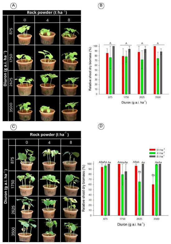 Dry biomass of Cucumis sativus (% relative to the control) 21 days after emergence, cultivated in soil previously treated with diuron residues (875; 1750; 2625; and 3500 g a.i. ha−1) and rock powder doses (0, 4, and 8 t ha−1) remediated by Canavalia ensiformis for 120 days in Oxisol (A,B) and Inceptisol (C,D). Columns represent the means, and the bars represent the standard error (±EP) of the mean (n = 4). Means followed by the same letter do not differ statistically from each other; uppercase represents the difference between doses of diuron and lowercase doses of rock powder by Tukey’s test (p < 0.05).