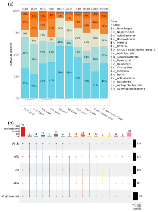Comparative analysis of the bacterial endophytic community composition of grapevine cultivars and wild grape Vitis amurensis growing in Primorsky Krai of Russia according to genomic approach (NGS). The composition of endophytic bacteria of grapevine variates Pr-St—Vitis Elmer Swenson 2-7-13 cv. Prairie Star from commercial vineyard PRIM ORGANICA; Alfa—Vitis labrusca × Vitis riparia cv. Alfa from PRIM ORGANICA; Ad—Vitis vinifera × V. amurensis cv. Adele from commercial vineyard Makarevich; Muk—V. riparia × V. vinifera cv. Mukuzani; V. amurensis—the sum of data for all V. amurensis grapevines obtained early [39]: (a) class-level taxonomical bar plots for the bacteria endophytic community depends on the variates of grapevines, and the sum of data for all V. amurensis grapevines obtained early [39]; (b) genus-level UpSet diagrams depicting overlapping taxa of NGS in different cultivars of grapevines. For each biocompartment, taxa were filtered based on relative abundance > 0.1%. Taxa with relative frequencies < 0.1% were removed from the UpSet plot. Number of sequences are shown above taxonomical bar plots. For clustering in bar plots, we used unweighted pair group method with arithmetic mean (UPGMA).
