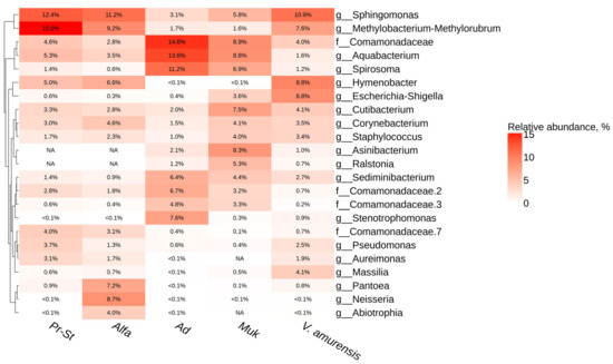 Genus-level relative endophytic bacteria abundance heat map of significant taxa according to next-generation sequencing (NGS) in grapevines cultivars and wild grape Vitis amurensis. Pr-St—Vitis Elmer Swenson 2-7-13 cv. Prairie Star from commercial vineyard PRIM ORGANICA; Alfa—Vitis labrusca × Vitis riparia cv. Alfa from PRIM ORGANICA; Ad—Vitis vinifera × V. amurensis cv. Adele from commercial vineyard Makarevich; Muk—V. riparia × V. vinifera cv. Mukuzani; V. amurensis—the sum of data for all V. amurensis grapevines obtained early [39]. The top 10 most abundant taxa from each grapevine are displayed. White squares (NA) represent the absence of taxa.