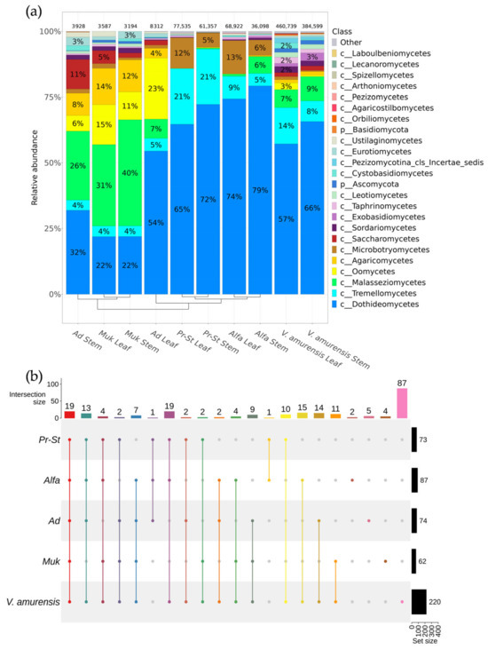 Comparative analysis of the fungal and fungi-like endophytic community grapevine cultivars and wild grape Vitis amurensis growing in Primorsky Krai of Russia according to genomic approach (NGS). The composition of endophytic fungi and fungi-like microorganisms of grapevine variates Pr-St—Vitis Elmer Swenson 2-7-13 cv. Prairie Star from commercial vineyard PRIM ORGANICA; Alfa—Vitis labrusca × Vitis riparia cv. Alfa from PRIM ORGANICA; Ad—Vitis vinifera × V. amurensis cv. Adele from commercial vineyard Makarevich; Muk—V. riparia × V. vinifera cv. Mukuzani; V.amurensis—the sum of data for all V. amurensis grapevines obtained early [39]: (a) class-level taxonomical bar plots for the fungal and fungi-like endophytic community depend on the variates of grapevines, and the sum of data for all V. amurensis grapevines obtained early [39]; (b) genus-level UpSet diagrams depicting overlapping taxa of NGS in different cultivars of grapevines. For each biocompartment, taxa were filtered based on relative abundance > 0.1%. Taxa with relative frequencies < 0.1% were removed from the UpSet plot. Number of sequences are shown above taxonomical bar plots. For clustering in the bar plots, we used UPGMA.