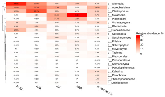 Genus-level relative endophytic fungi and fungi-like microorganism abundance heat maps of significant taxa according to next-generation sequencing (NGS) in grapevine cultivars and wild grape Vitis amurensis. Pr-St—Vitis Elmer Swenson 2-7-13 cv. Prairie Star from commercial vineyard PRIM ORGANICA; Alfa—Vitis labrusca × Vitis riparia cv. Alfa from PRIM ORGANICA; Ad—Vitis vinifera × V. amurensis cv. Adele from commercial vineyard Makarevich; Muk—V. riparia × V. vinifera cv. Mukuzani; V.amurensis—the sum of data for all V. amurensis grapevines obtained early [39]. The top 10 most abundant taxa from each grapevine are displayed. White squares (NA) represent the absence of taxa.