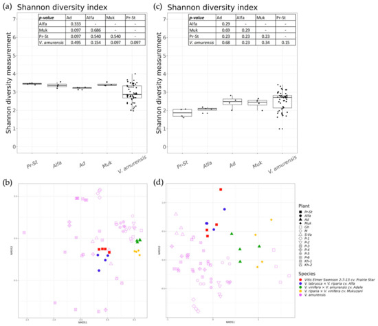 A comparison of endophytic bacterial, fungi, and fungi-like microorganism communities of grapevine cultivars and wild grape Vitis amurensis. Pr-St—Vitis Elmer Swenson 2-7-13 cv. Prairie Star from commercial vineyard PRIM ORGANICA; Alfa—Vitis labrusca × Vitis riparia cv. Alfa from PRIM ORGANICA; Ad—Vitis vinifera × V. amurensis cv. Adele from commercial vineyard Makarevich; Muk—V. riparia × V. vinifera cv. Mukuzani; V.amurensis—the sum of data for all V. amurensis grapevines obtained early [39]: (a) Shannon’s alpha diversity boxplot of bacterial communities; (b) Bray–Curtis beta diversity NMDS plot of bacterial communities; (c) Shannon’s alpha diversity boxplot of fungi and fungi-like microorganism communities; (d) Bray–Curtis beta diversity NMDS plot of fungi and fungi-like microorganism communities.