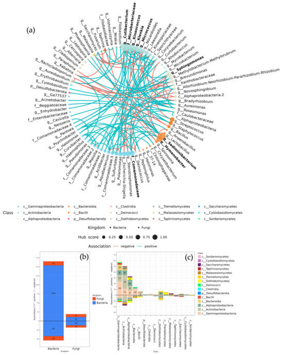 Positive and negative associations of endophytic bacteria and fungi in the Vitis microbiome. (a) Interdomain ecological networks of the bacterial–fungal associations; (b) summary bar plot of kingdom-level bacteria-fungi associations; (c) summary bar plot of class-level bacteria–fungi associations. The top 10% taxa of genus level based on the values of Kleinberg’s hub centrality score were qualified as hubs. In (a), hub taxa are shown in bold.