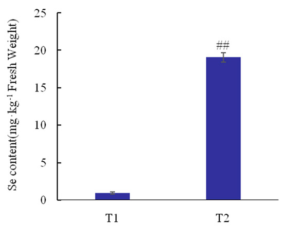 No toxicity symptoms were observed in the leaves and roots of tea plants when the selenite concentration in nutrient solutions was 0 or 0.05 mmol·L−1. Moreover, the total Se content of tea plants roots increased obviously by 20.28-fold under selenite treatment (p < 0.01; Figure 1).