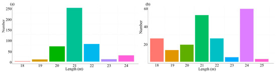 The length of the known and novel miRNAs ranged from 18 to 25 nt. 21-nt miRNAs were the most abundant among the known miRNAs (Figure 2a), while 24-nt miRNAs were most abundant among the novel miRNAs (Figure 2b). The formation of miRNA mature bodies was achieved by shearing of the Dicer enzyme and Dicer-like enzyme (DCL), and 21-nt or 24-nt dominated miRNAs were eventually generated due to the characteristic nature of the two enzymes. The nucleotide length distribution of miRNAs was similar to previous studies in Gossypium hirsutum and Chinese cabbage [41,42].