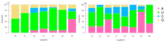 Different base positions across the miRNA molecule have different nucleotide bases preferences. Based on the results, the 5′ end bases of the known miRNAs of 19–23 nt in length were mostly U, while the miRNAs of 24 nt in length were mostly A (Figure 3a). Among the novel miRNAs, those with lengths of 20 nt and 24 nt had A in higher frequency in the 5′ end, while those with a length of 22 nt had C and U, and those with a length of 18–19 nt, 21 nt, 23 nt, and 25 nt had mostly U in higher frequency, respectively (Figure 3b).