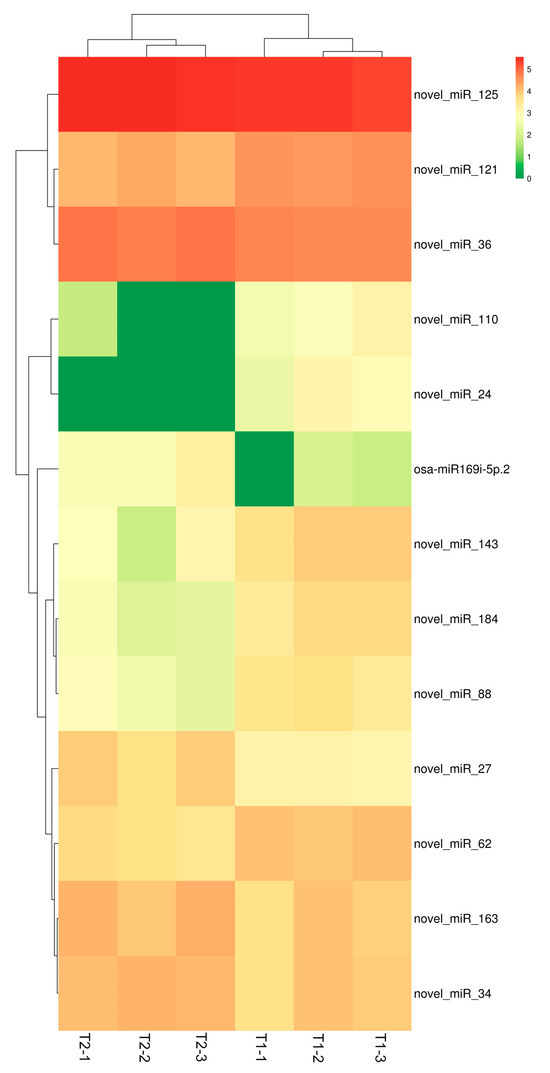 By comparing the miRNAsequence data in the two libraries corresponding to the different treatments, 6 miRNAs (osa-miR169i-5p.2, novel_miR_125, novel_miR_163, novel_miR_27, novel_miR_34, novel_miR_36) were identified with up-regulated expression, among which 2 miRNAs (osa-miR169i-5p.2, novel_miR_27) were more than 2-fold up-regulated under selenite treatment. On the other hand,7 miRNAs (novel_miR_110, novel_miR_121, novel_miR_143, novel_miR_184, novel_miR_24, novel_miR_62, novel_miR_88) were down-regulated, among which 5 miRNAs (novel_miR_110, novel_miR_143, novel_miR_184, novel_miR_24, novel_miR_88) were more than 2-fold down-regulated under selenite treatment (Figure 4). The sequences of differentially expressed miRNAs were shown in the Table S4, and the sample correlation relationship was shown in the Figure S1.