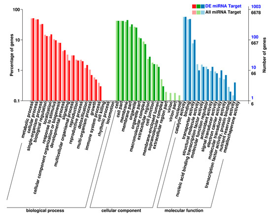 Function classifications of GO terms of target genes of the differentially expressed miRNAs. The X-axis corresponds to the GO classification, the left side of the Y-axis indicates the percentage of genes of each term within the GO category, and the right side indicates the number of genes. This graph showed the gene enrichment of each secondary function of GO in the background of differentially expressed miRNA target genes and the background of all the genes, reflecting the status of each secondary function in the two backgrounds, and the secondary functions with obvious differences in the proportions indicated that the enrichment trend of differentially expressed miRNA target genes is different from that of all the genes.