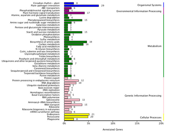 KEGG pathway enrichment analysis was conducted on the differentially expressed miRNAs’ target genes (Figure 6). The target genes were enriched in forty-nine pathways. The top 5 KEGG pathways in terms of enriched target genes were plant-pathogen interaction (29 genes), endocytosis (21 genes), peroxisome (20 genes), biosynthesis of amino acids (19 genes), and plant hormone signal transduction (17 genes).