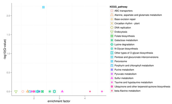 The degree of pathway enrichment was assessed using the Enrichment Factor, and the enrichment significance was calculated using Fisher’s exact test. KEGG pathway analysis revealed 20 pathways with significant enrichment (Figure 7), including sulfur metabolism, peroxisome, beta-alanine metabolism, ABC transporters, alanine, aspartate and glutamate metabolism, base excision repair, circadian rhythm-plant, DNA replication, endocytosis, folate biosynthesis, galactose metabolism, lysine degradation, N-Glycan biosynthesis, other types of O-glycan biosynthesis, pentose and glucuronate interconversions, porphyrin and chlorophyll metabolism, purine metabolism, pyruvate metabolism, taurine and hypotaurine metabolism and ubiquinone and other terpenoid-quinone biosynthesis. The top 3 pathways were beta-alanine metabolism, taurine and hypotaurine metabolism, and sulfur metabolism, implying that these metabolic pathways played important roles in tea plants’ metabolic response under selenite treatment.