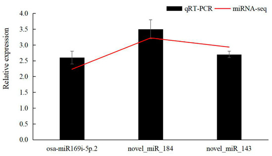 To verify the accuracy of sequencing, 3 miRNAs were randomly selected for fluorescence quantitative PCR analysis. Among them, osa-miR169i-5p.2 was up-regulated, and novel_miR_184 and novel_miR_143 were down-regulated (Figure 8). These fluorescence quantitative PCR results validated the trends identified by sequencing.