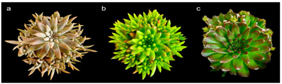 Three Orostachys species (Figure 1), namely, O. fimbriata, O. japonica, and O. minuta, were utilized in this study and were brought to the Experiment Greenhouse of the Department of Environmental Horticulture, Sahmyook University, South Korea.