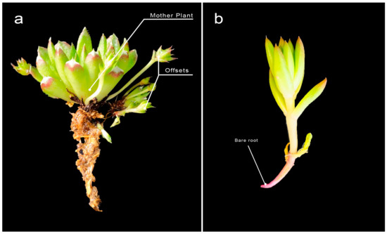 Plant propagules of an Orostachys species showing: (a) the mother plant with several attached offsets growing at its basal area (O. minuta); and (b) the detached offset as bare root, which was used as propagule (O. japonica).